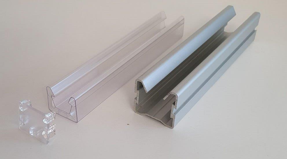 These joining profiles can be made of polycarbonate, to achieve maximum transparency of the solution without visible visual interruption, or aluminum, to ensure greater load resistance.